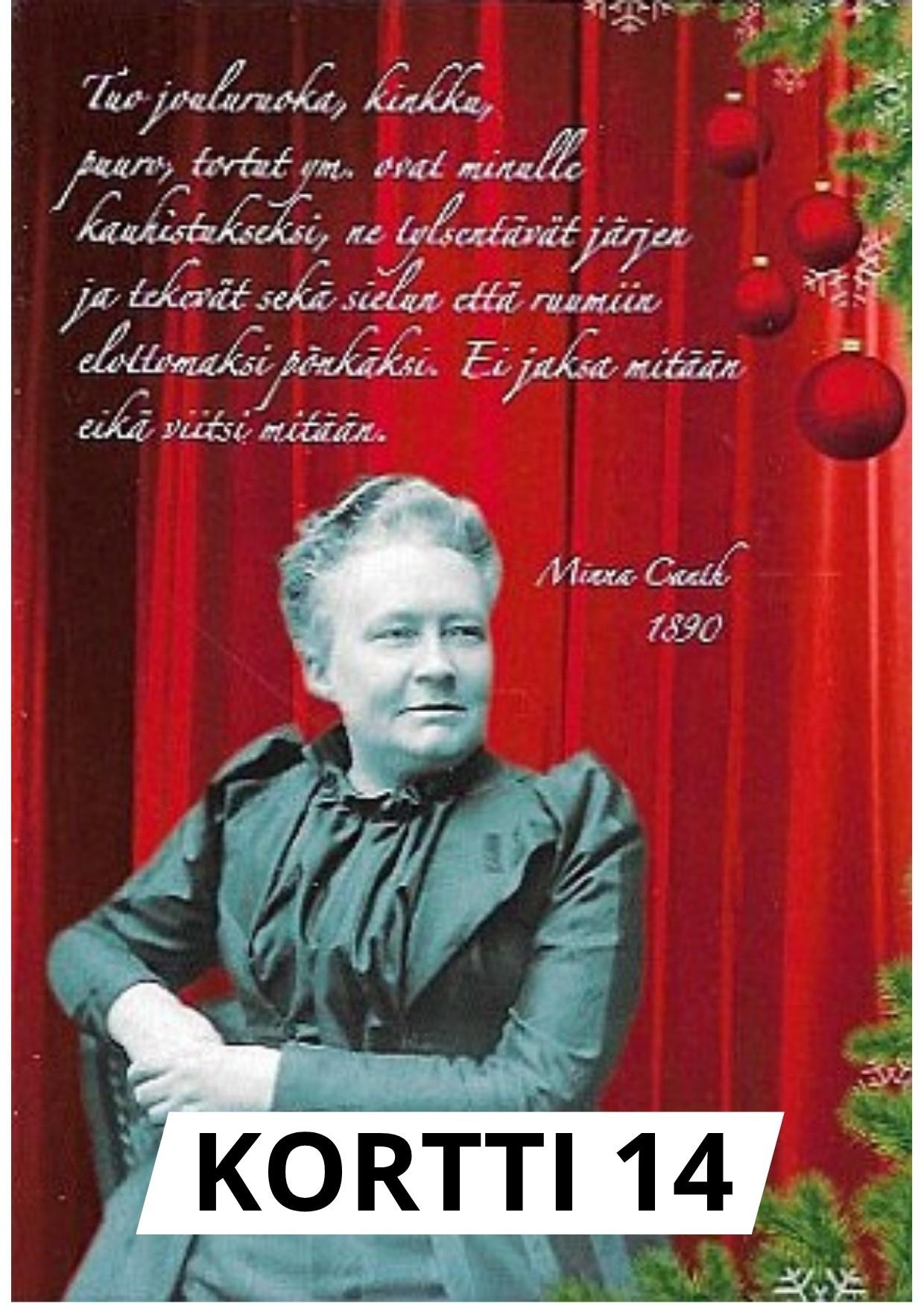 Kortti 14 "Tuo jouluruoka, kinkku, puuro, tortut ym. ovat minulle kauhistukseksi, ne tylsentävät järjen ja tekevät sekä sielun että ruumiin elottomaksi pönkäksi. Ei jaksa mitään eikä viitsi mitään."