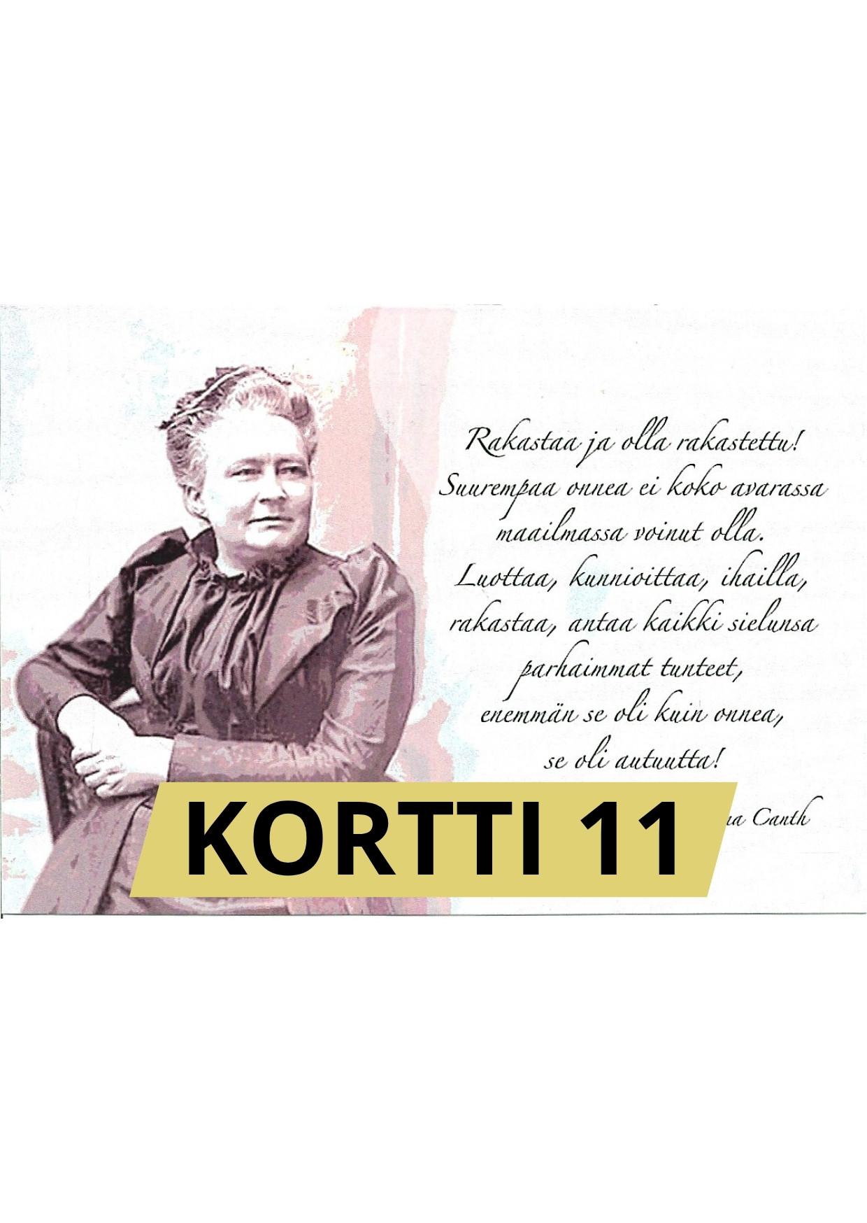 Kortti 11 "Rakastaa ja olla rakastettu! Suurempaa onnea ei koko avarassa maailmassa voinut olla. Luottaa, kunnioittaa, ihailla, rakastaa, antaa kaikki sielunsa parhaimmat tunteet, enemmän se oli kuin onnea, se oli autuutta!"