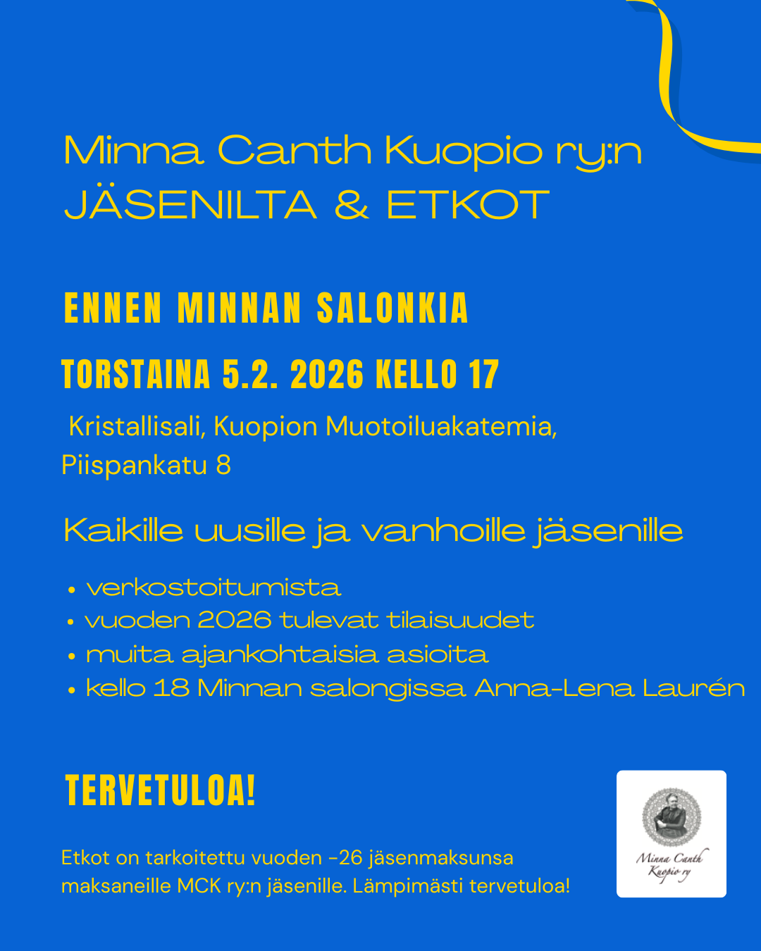 Aloitamme vuoden torstaina 5. helmikuuta Piispankatu 8:ssa Minna Canth Kuopio ry:n jäsentapaamisella ennen Minnan Salongin alkamista. Etkot alkavat kello 17. Käydään läpi vuoden toimintaa, tutustutaan…