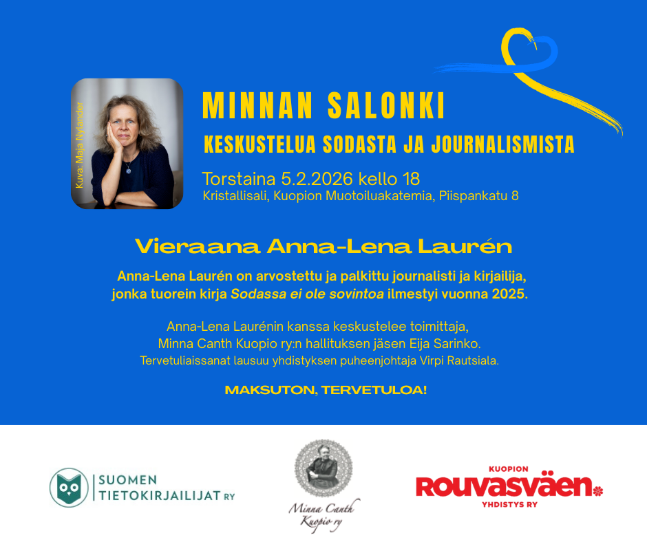 Tämän vuoden ensimmäinen Minnan salonki järjestetään torstaina 5.2.2026 klo 18 Kuopion muotoiluakatemialla, osoitteessa Piispankatu 8. Vieraana Anna-Lena Laurén. Illan otsikkona on Keskustelua sodasta…