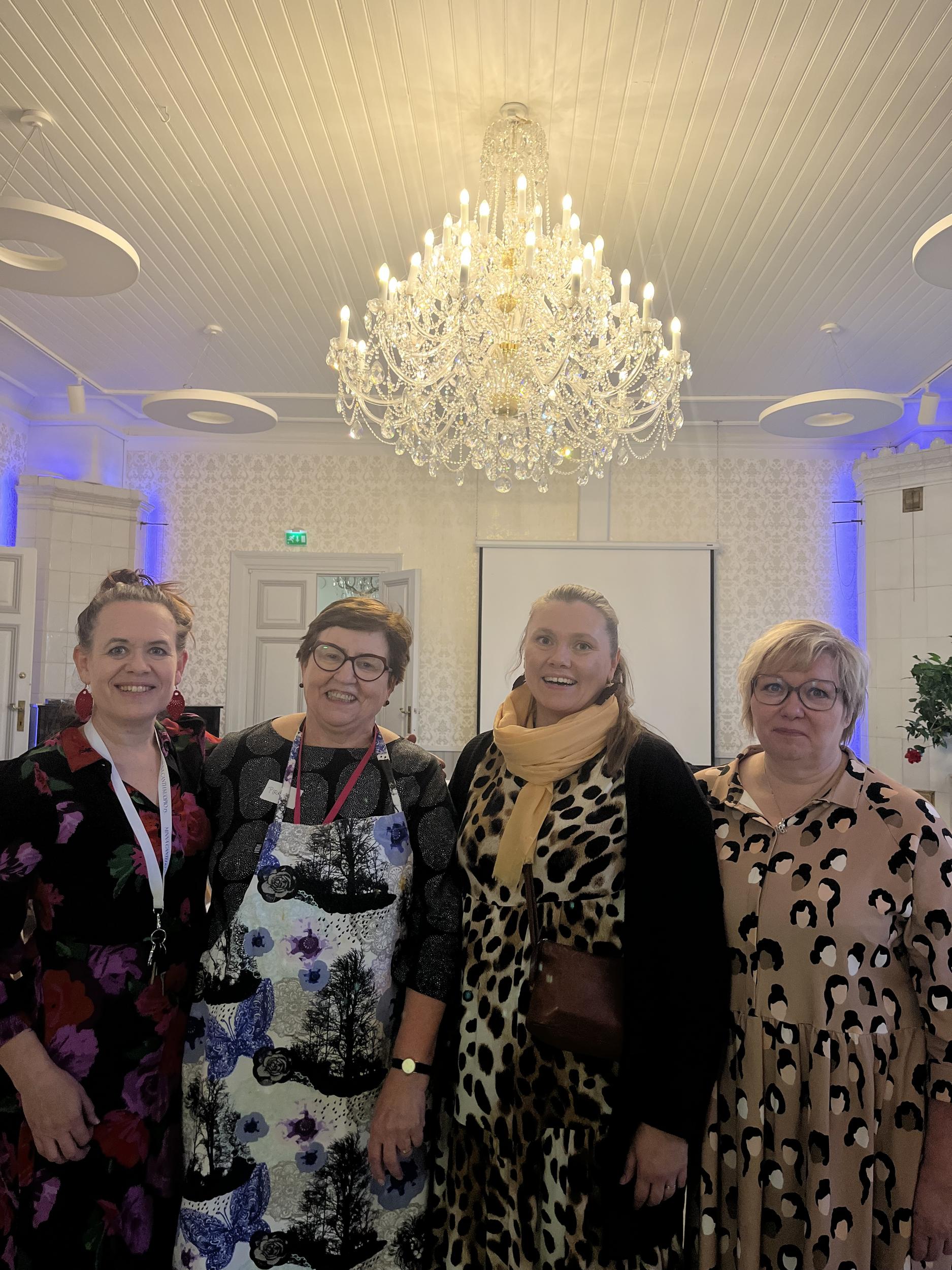 Ylhäällä: Kansainvälisen Tyttöjen päivän juhlan vapaaehtoinen yhteisselfie. Alla: järjestäjien ydintiimi Virpi Rautsiala (Minna Canth Kuopio ry.), Pirkko Ulmanen (Naisten Pankki Kuopio), Annukka Rytkönen (Tyttöjen talo/Setlementti Puijola) ja Marika Salminen (Kuopion Rouvasväenyhdistys)